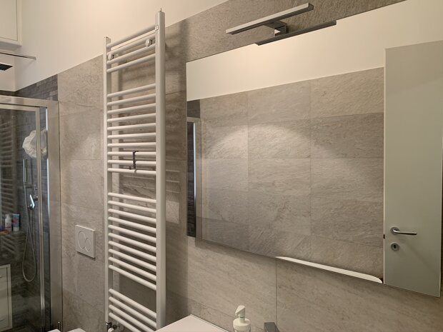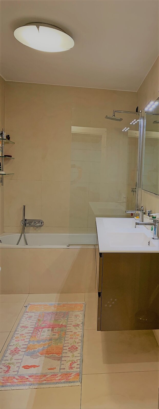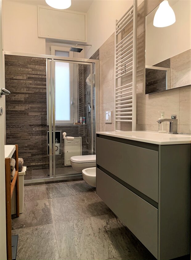 Un pratico antibagno con lavatrice conduce a un raffinato bagno, un vero e proprio angolo di benessere con vasca da bagno e doppi lavandini.