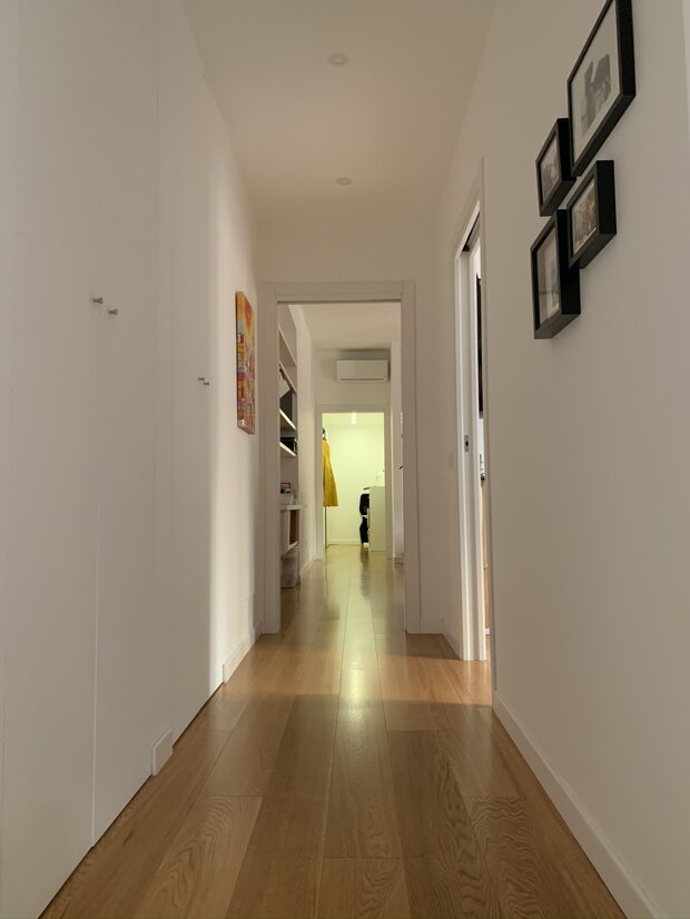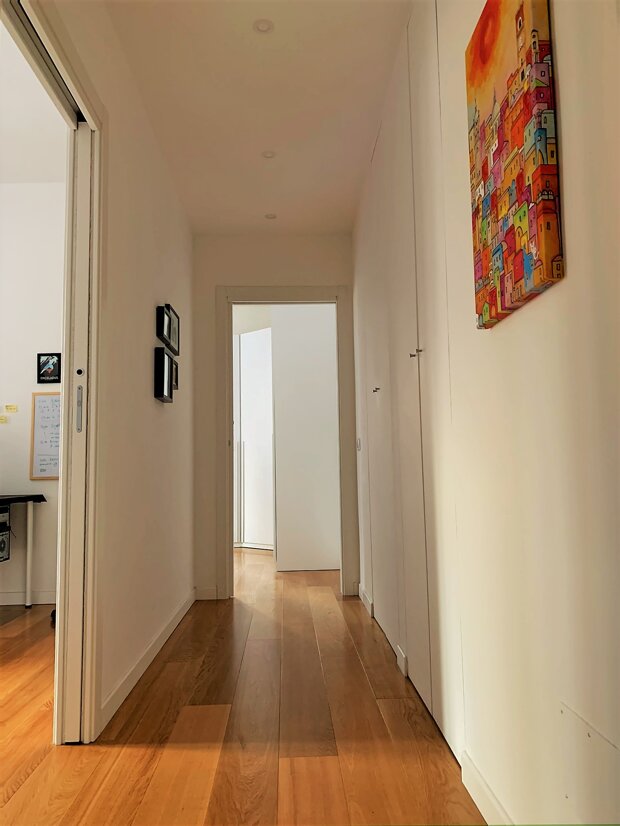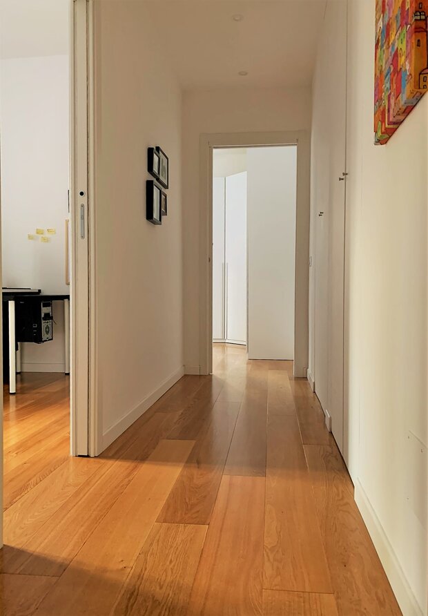 L’ingresso conduce a un ampio soggiorno con moderna cucina a vista, ambiente ideale per vivere e ricevere con stile. La zona notte è composta da due camere matrimoniali, di cui una con balcone, perfetta come stanza padronale o studio. Il bagno finestrato è dotato di una comoda doccia. Completano la proprietà una cantina e i numerosi comfort che caratterizzano l’appartamento: parquet in tutti gli ambienti (tranne il bagno), doppi vetri, aria condizionata e riscaldamento centralizzato con termovalvole.